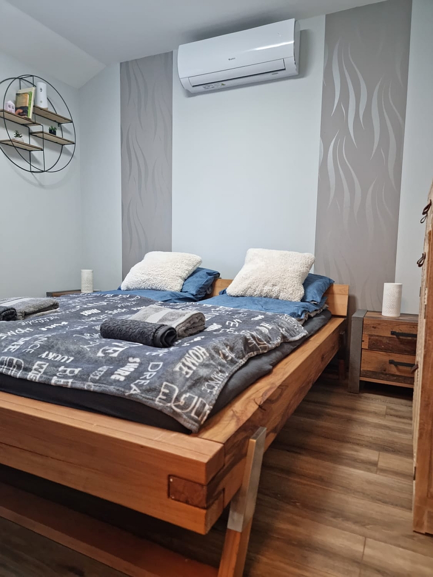 A szoba vendégházunk felső szintjén található, egy 160×200mm-es francia ággyal. A szoba klimatizált, síkképernyős smart tv-vel felszerelt, netflix hozzáféréssel.